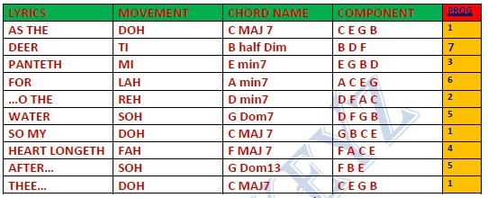 Let us consider the first line of As the deer …Melody notes…m,s,s definitely this can onlhy be found in the chord : Doh: m: soh… and that’s how to determine which chord goes per time by considering the melody note per time For instance, if the melody notes were r,f,m,f,m might have considered the following chords r:f:l(2), f:l:d(4), l:d:m(6), l:d:f(4INV)